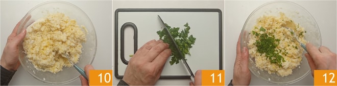 Mélangez pour amalgamer tous les ingrédients 10. Lavez et séchez du persil, hachez-le finement 11 et ajoutez-le au riz. Mélangez à nouveau 12.