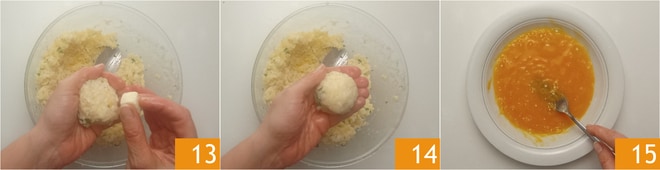 Prenez une poignée de riz, placez au centre un cube de mozzarella 13 et formez la boulette 14, répétez les mêmes étapes jusqu'à épuisement du riz. Dans une assiette, cassez deux œufs, ajoutez une pincée de sel et battez vigoureusement avec une fourchette 15, disposez la farine et la chapelure dans d'autres assiettes.