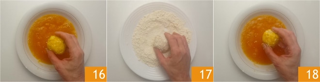 Roulez les boulettes d'abord dans l'œuf 16, puis dans la farine 17, encore dans l'œuf 18 et finalement dans la chapelure. Pendant ces étapes, veillez à ce que toute la surface des boulettes soit bien enrobée de panure.