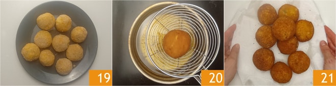 Placez les boulettes au fur et à mesure sur une assiette jusqu'à épuisement des ingrédients, vous en obtiendrez environ 15 19. Faites chauffer l'huile d'arachide jusqu'à 150°C, plongez-y les boulettes, quelques-unes à la fois, retirez-les avec une écumoire lorsqu'elles sont dorées 20 et placez-les sur un papier absorbant pour éliminer l'excès d'huile. Les boulettes de riz sont prêtes à être dégustées 21.
