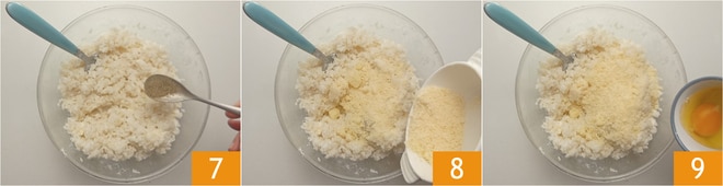 Ajoutez une pincée de poivre 7, le fromage râpé 8 et un œuf 9.