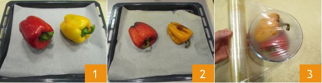 Pour préparer les boulettes de thon et ricotta avec poivrons, commencez par laver et sécher les deux poivrons 1 ; puis placez-les sur une plaque de cuisson et enfournez-les pendant environ 30-40 minutes à 250°, en les retournant de temps en temps jusqu'à ce que la peau soit bien grillée 2. Une fois grillés, mettez-les dans un sac en plastique, ou dans un bol couvert de film plastique pendant environ 15 minutes 3.