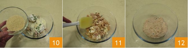 Ajoutez ensuite le fromage râpé, la chapelure, le sel et le poivre 10. Mélangez le tout avec une cuillère 11 et terminez de pétrir avec les mains jusqu'à obtenir un mélange homogène 12.