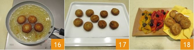 Faites-les cuire pendant environ 6 minutes en les dorant bien des deux côtés 16. Mettez les boulettes à égoutter sur du papier absorbant de cuisine 17 et servez-les encore chaudes accompagnées des poivrons 18.