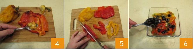 Une fois le temps écoulé, sortez les poivrons du sac et enlevez la peau qui se retirera assez facilement. Une fois pelés, enlevez les graines et les filaments intérieurs des poivrons 4, puis coupez-les en lanières 5. Mettez les poivrons dans un bol et assaisonnez-les avec le thym haché, le sel, l'ail écrasé, l'huile d'olive extra vierge et enfin les olives noires dénoyautées coupées en tranches 6. Mélangez les ingrédients et laissez reposer le tout.