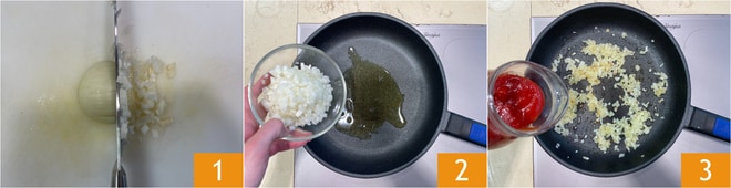 Pour préparer les boulettes à la sauce de grand-mère, épluchez et hachez la moitié d'un oignon 1. Dans une poêle, versez un filet d'huile et ajoutez l'oignon haché 2. Faites revenir l'oignon pendant environ 5 minutes ou jusqu'à ce qu'il soit tendre, puis versez la purée de tomates 3 et salez.