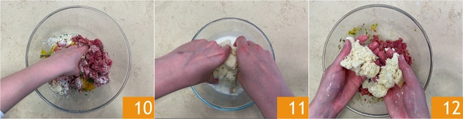 Pétrissez pour bien mélanger 10. Pendant ce temps, le pain sera ramolli, pressez-le 11 et ajoutez-le au reste de la préparation 12.