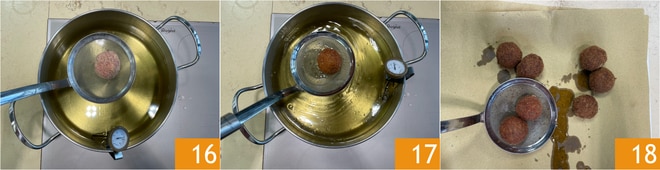 Chauffez l'huile de friture, une fois atteints les 170°, plongez quelques boulettes à la fois 16 et faites-les frire jusqu'à ce qu'elles soient dorées 17. Égouttez les boulettes frites sur un plateau recouvert de papier absorbant 18.