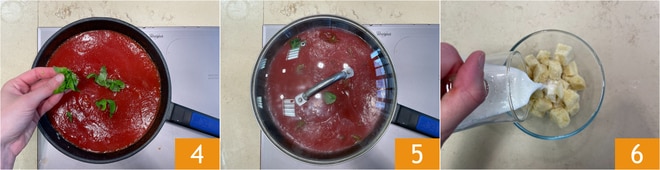 Assaisonnez avec les feuilles de basilic 4, couvrez avec un couvercle 5 et faites cuire pendant 10-15 minutes. Pendant que la sauce cuit, préparez les boulettes : dans un bol, trempez le lait avec le pain rassis.