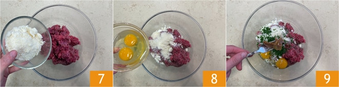 Dans un bol, versez la viande hachée, le fromage 7, les œufs 8, le sel, le persil haché et les anchois 9.