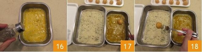 Cassez les œufs dans un autre récipient, battez-les et ajoutez le poivre 17. Retirez les boulettes de saumon du réfrigérateur et passez-les d'abord dans les œufs battus, puis dans le panko (17-18)