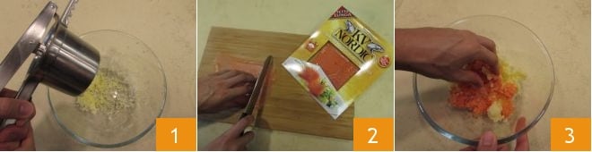 Pour préparer les boulettes frites au saumon et pommes de terre avec mayonnaise rapide au paprika, commencez par réaliser la pâte pour vos boulettes. Écrasez les pommes de terre 1, préalablement bouillies et laissées tiédir, et mettez-les dans un grand bol. Hachez finement le saumon avec un couteau 2, ajoutez-le aux pommes de terre et mélangez le tout à la main 3.