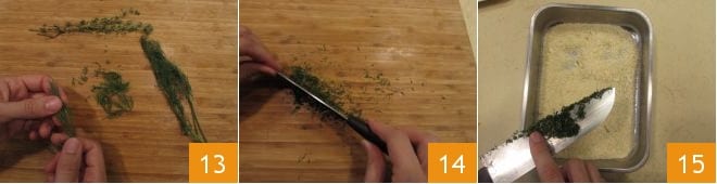 Une fois la sauce d'accompagnement préparée, concentrez-vous sur la panure pour vos boulettes au saumon. Effeuillez le thym et le fenouil 13, hachez-les finement 14 et mélangez-les avec le panko dans un récipient peu profond 15.