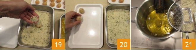 en vous assurant de bien les enrober de panure 19. Ensuite, placez-les sur un plateau 20. Versez l'huile de graines dans une casserole haute et chauffez-la jusqu'à atteindre une température de 160-170°C maximum (utilisez un thermomètre de cuisine pour mesurer la bonne température). Pour ne pas faire baisser la température de l'huile, faites frire peu de boulettes à la fois 21.