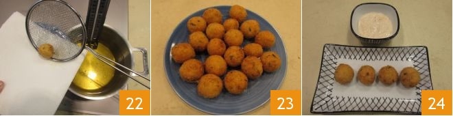 Environ 2 minutes de cuisson suffiront pour obtenir des boulettes bien dorées et croustillantes. Une fois prêtes, égouttez les boulettes à l'aide d'une écumoire et transférez-les sur un plateau recouvert de papier absorbant pour éliminer l'excès d'huile 22. Procédez de cette façon jusqu'à terminer toutes les boulettes au saumon et pommes de terre 23 et servez-les accompagnées de la mayonnaise rapide au paprika 24.