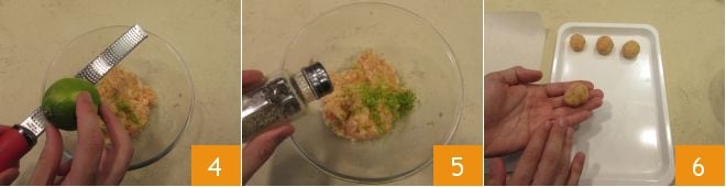 Râpez le zeste de citron vert directement dans le bol 4 et ajoutez le poivre 5. Mélangez encore jusqu'à obtenir une pâte homogène et formez 20 boulettes d'environ 20 g chacune 6, placez-les sur un plateau et mettez-les au réfrigérateur pendant au moins 30 minutes.