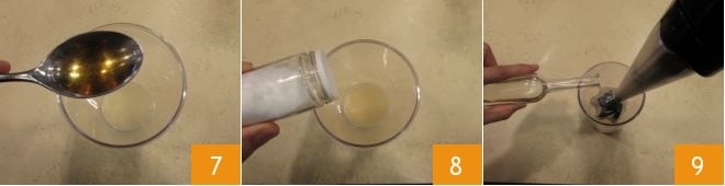 En attendant, préparez la sauce d'accompagnement. Versez dans un récipient haut le lait de soja et le vinaigre de cidre 7. Ajoutez le sel 8 et émulsionnez le tout avec un mixeur plongeant, en ajoutant l'huile de graines en filet 9,