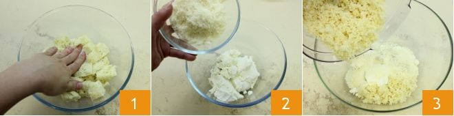 Pour préparer les boulettes monstrueuses, préparez le bouillon de légumes nécessaire pour les boulettes et pour la cuisson des pommes de terre, puis occupez-vous de la pâte : dans un bol, faites tremper la mie de pain dans le lait 1, en veillant à ce qu'elle soit complètement absorbée. Pendant ce temps, dans un autre bol, versez la ricotta, le fromage râpé 2, la noix de muscade râpée ; ajoutez également le pain imbibé légèrement essoré 3 et l'œuf.