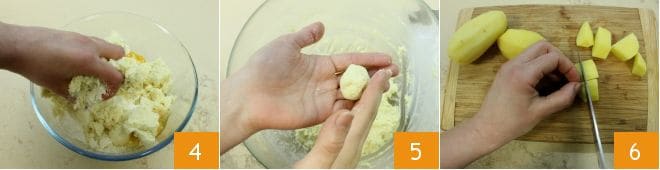 Salez à votre convenance et pétrissez avec les mains 4. Si la pâte est trop molle, ajoutez 30 g de chapelure. Humidifiez légèrement vos mains pour éviter que le mélange ne colle et formez 20 petites boulettes d'environ 20 g chacune 5 et réservez-les. Continuez la préparation en commençant par la crème de pommes de terre : épluchez les pommes de terre, coupez-les en morceaux 6