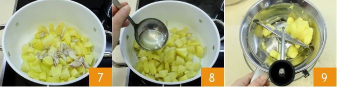 puis faites-les cuire à feu moyen dans une grande casserole avec l'échalote 7, un filet d'huile. Versez le bouillon de légumes pour les recouvrir à peine 8 pour faciliter la cuisson (cela prendra environ 40 minutes). Une fois prêtes, écrasez-les avec un presse-purée 9