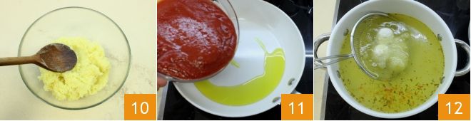 et recueillez-les dans un petit bol 10. Préparez ensuite la sauce tomate, en versant la purée de tomates dans une poêle arrosée d'un filet d'huile 11 ; faites cuire environ 15 minutes à feu doux et quand elle est prête, ajustez le sel et ajoutez 3 petites feuilles de basilic frais. Ensuite, portez à ébullition le bouillon nécessaire à la cuisson des boulettes et plongez-en quelques-unes à la fois pendant quelques minutes 12.