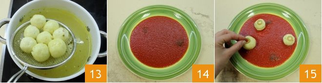 Puis égouttez-les 13 et laissez-les sécher sur un plateau recouvert de papier absorbant. À ce stade, composez vos assiettes : sur chacune, versez la sauce tomate 14, déposez 3-4 boulettes et sur chacune, placez une tranche d'olive verte dénoyautée pour simuler l'œil 15.