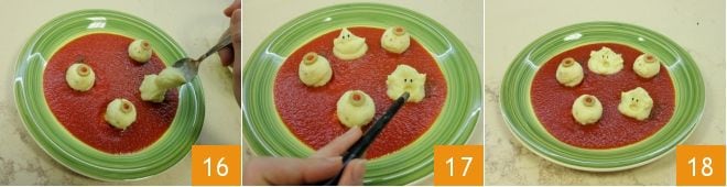À côté des boulettes, versez une ou deux cuillères à café de crème de pommes de terre 16 (vous pouvez également utiliser une poche à douille pour créer un nuage de crème de pommes de terre), en leur donnant la forme de petits fantômes 17 et réalisez les yeux avec des graines de sésame noir. Voici votre recette des boulettes monstrueuses prête 18 !