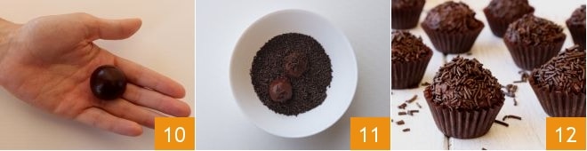 Formez des boules 10 et passez-les dans un petit bol avec les vermicelles de chocolat 11. Placez les boules au fur et à mesure dans des caissettes et servez les brigadeiro 12.