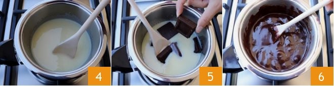 et mélangez délicatement avec une cuillère en bois pour le faire fondre complètement 4. Ajoutez le chocolat noir en morceaux 5 et mélangez de temps en temps en cuisant le mélange pendant 15 minutes : il doit atteindre une consistance crémeuse, compacte 6 et se détacher du fond de la casserole.