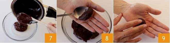 Transférez le mélange dans un bol 7 et laissez-le tiédir à température ambiante. Prélevez avec une cuillère environ 20 g de mélange 8 et roulez-le entre vos mains légèrement beurrées 9 : avec ces doses, vous obtiendrez environ 20 bonbons.