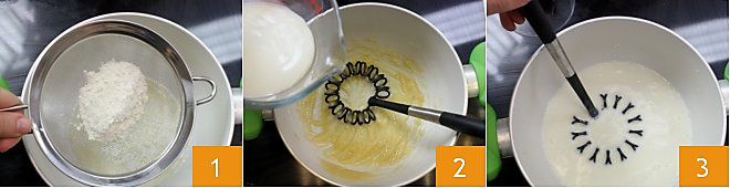 Pour préparer les brochettes à la bolognaise, commencez par la béchamel. Pour le procédé, vous pouvez également consulter la fiche de la béchamel. Dans une grande casserole, faites fondre le beurre à feu doux, puis ajoutez la farine tamisée 1. Mélangez avec un fouet à spirale ou un fouet normal pour éviter la formation de grumeaux et ajoutez progressivement le lait en filet 2. Mélangez jusqu'à ce que la béchamel ait pris la consistance d'une crème veloutée 3. Ajoutez ensuite le sel, le poivre au goût et une râpée de noix de muscade. Maintenant que la béchamel est prête, transférez-la dans un petit bol et laissez-la tiédir. Si vous préparez la béchamel pour les brochettes bien à l'avance, il est conseillé de la placer dans un bol recouvert de film plastique pour éviter qu'elle ne se dessèche trop. Si elle devient trop épaisse, vous pouvez la diluer avec du lait froid, en mélangeant avec un fouet.