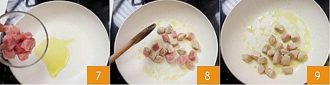 Dans une poêle, mettez un filet d'huile d'olive et faites sauter les dés de longe pendant quelques minutes 7, en les tournant souvent pour les saisir de tous les côtés (8-9). Retirez-les du feu et laissez-les tiédir avant de commencer à former les brochettes.