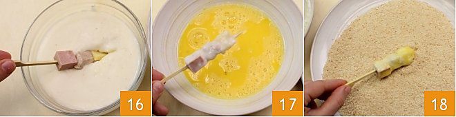 Dans l'ordre, immergez chaque brochette d'abord dans la béchamel que vous aviez mise de côté 16, puis dans l'œuf 17 et enfin passez-les dans la chapelure 18.