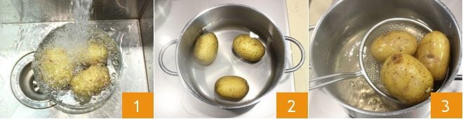 Pour réaliser les brochettes de gnocchis gratinées, commencez par préparer les gnocchis blancs (pour plus de détails, consultez la recette Gnocchis de pommes de terre). Lavez les pommes de terre 2 et, sans les éplucher, mettez-les dans une casserole avec de l'eau salée et laissez-les bouillir pendant environ 25-30 minutes 2 jusqu'à ce qu'elles soient tendres, puis égouttez-les 3.