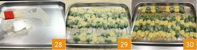 Puis badigeonnez de beurre fondu un plat assez large pour contenir les brochettes 28. Déposez les brochettes sur le plat et badigeonnez la surface avec le reste du beurre fondu et avec les fromages râpés 29. Faites gratiner dans un four préchauffé avec la fonction grill pendant 10 minutes à 220°. Une fois la cuisson terminée, sortez les brochettes de gnocchis gratinées 30 et servez-les chaudes.