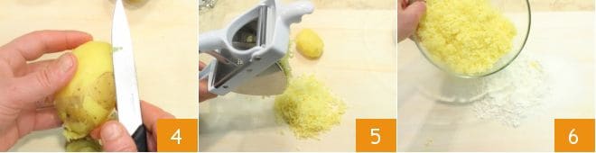 Encore chaudes, épluchez-les 4, écrasez-les avec un presse-purée 5 et mettez-les sur un plan de travail avec la farine 6
