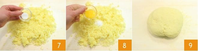 faites un petit puits et ajoutez au centre le sel 7, le jaune d'œuf 8 et pétrissez le tout jusqu'à obtenir une pâte compacte. Pétrissez jusqu'à obtenir une pâte compacte, lisse et sans grumeaux 9.