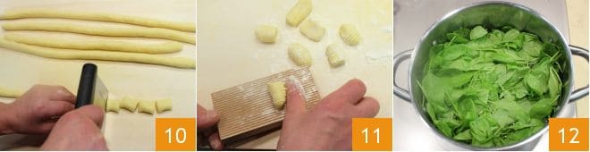Divisez la pâte en plusieurs boudins d'une épaisseur de 2-3 centimètres et commencez à couper vos gnocchis 10. Pour finir, réalisez les rainures caractéristiques des gnocchis en faisant glisser chaque gnocchi sur l'outil en bois dentelé 11 ou sur une fourchette. Passez maintenant aux gnocchis verts (pour tous les détails, consultez la recette : Gnocchetti verts) lavez les épinards et faites-les cuire dans un peu d'eau salée 12. Dans une autre casserole, faites cuire les pommes de terre en les mettant à bouillir avec la peau comme vous l'avez fait précédemment avec les gnocchis classiques.