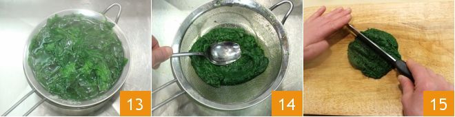 Une fois la cuisson terminée, égouttez les épinards et pressez-les bien à l'aide d'une passoire (13-14), puis hachez-les finement avec un couteau 15.