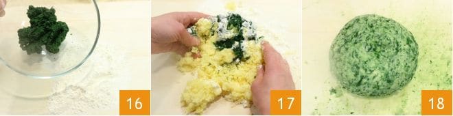 Sur un plan de travail, mettez la farine, les épinards 16, les pommes de terre pelées et écrasées et pétrissez le tout 17 jusqu'à obtenir une pâte compacte 18.