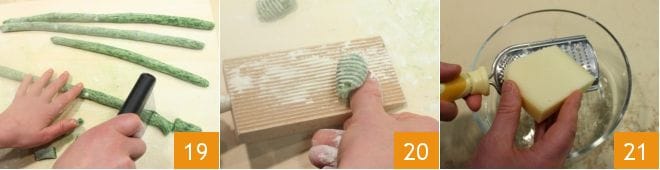 Poursuivez comme vous l'avez fait précédemment : divisez la pâte en plusieurs boudins d'une épaisseur de 2-3 centimètres et commencez à couper vos gnocchis avec un coupe-pâte 19. Pour finir, réalisez les rainures typiques 20. Au fur et à mesure que vous les réalisez, placez les gnocchis finis sur un plateau recouvert d'un torchon fariné. D'autre part, râpez le Montasio 21 et le Grana.