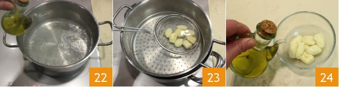 Cuisez tous les gnocchis blancs dans de l'eau salée avec un filet d'huile d'olive 22 égouttez-les lorsqu'ils remontent à la surface, cela prendra quelques minutes, puis égouttez-les 23, placez-les dans un petit bol et assaisonnez-les avec un filet d'huile d'olive 24.