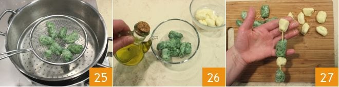 Cuisez de la même manière les gnocchis verts puis égouttez-les 25, placez-les dans un petit bol et assaisonnez-les avec un peu d'huile 26. À ce stade, vous pouvez composer les brochettes : prenez un pic en bois et embrochez-les en alternant les blancs et les verts 27.