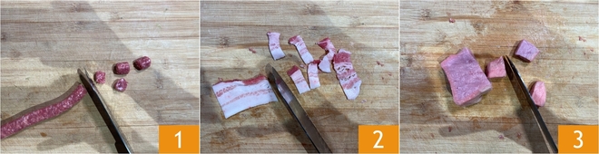 Pour préparer les brochettes de viande à la friteuse à air, commencez par découper en morceaux la saucisse de porc sans retirer le boyau 1. Maintenant, coupez la pancetta en lanières d'environ 2 cm d'épaisseur 2 et la viande de veau en cubes de 2 cm 3.