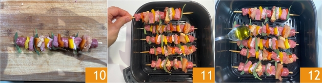 Continuez d'alterner viande et légumes selon votre goût jusqu'à obtenir 8 brochettes : l'important est que tous les ingrédients soient proches les uns des autres et qu'il reste un peu d'espace aux extrémités 10. Déposez les brochettes dans le panier de la friteuse à air (nous avons utilisé une friteuse de 6 litres) 11 et arrosez d'un filet d'huile d'olive extra vierge 12.