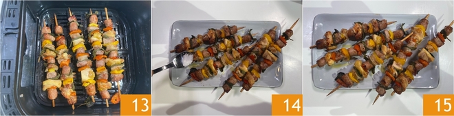 Faites cuire à 160° pendant 13 minutes 13, en les retournant à mi-cuisson. Salez selon votre goût 14 et servez immédiatement vos brochettes de viande à la friteuse à air 15 !