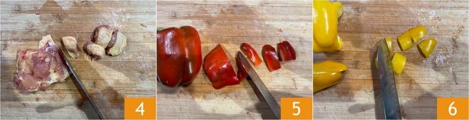 Coupez également les cuisses de poulet désossées en morceaux de 2 cm, puis taillez en petits dés les poivrons rouges 5 et les poivrons jaunes 6.