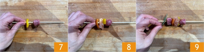 Maintenant que tous les ingrédients sont prêts, passez au montage des brochettes : enfilez sur les pics un morceau de saucisse et un morceau de poivron 7, puis continuez avec la pancetta et un autre morceau de poivron 8. Ajoutez le veau et une feuille de sauge 9.