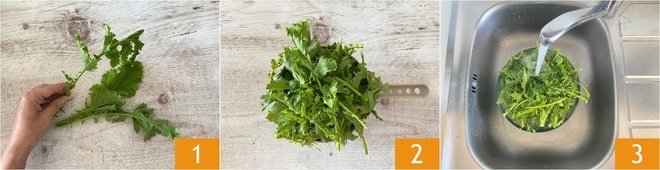 Pour préparer les brocoli-rave à la poêle, commencez d'abord par nettoyer les légumes. Éliminez les tiges les plus dures et les feuilles extérieures 1. Une fois nettoyés, vous obtiendrez environ 360 g de brocoli-rave 2, lavez-les plusieurs fois avec de l'eau froide 3 et égouttez-les.