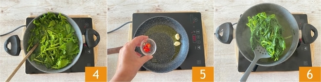 Mettez sur le feu une grande casserole d'eau et lorsqu'elle arrivera à ébullition, versez les brocoli-rave 4 et laissez-les cuire pendant 15 minutes. Lorsque 2-3 minutes manqueront, préparez dans une poêle un sauté avec de l'huile, 2 gousses d'ail entières et un piment en morceaux 5. Dès que les brocoli seront bien attendris, égouttez-les 6.